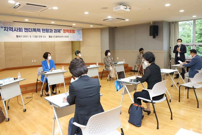 이동진 서울 도봉구청장이 7일 도봉여성센터 차미리사홀 및 대강당에서 열린 ‘지역사회 젠더폭력 현황과 과제’ 포럼에 참석해 포럼을 청취하고 관계자들과 의견을 나눴다. 사진은 포럼에 참석한 이 구청장이 인사말을 하고 있는 모습. (사진제공=도봉구청)