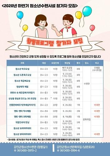 군은 코로나19로 비대면 프로그램을 확대하고 대면 프로그램의 경우 인원, 시간 등을 조절해 청소년들이 안전한 환경에서 활동할 수 있도록 한다. 청소년 활동은 오는 19일(토)부터 순차적으로 개강할 예정이며 신청은 군청 홈페이지 공지사항을 참조해 팩스나 메일로 하면 된다. 문의사항은 청소년수련관, 청소년문화의집으로 하면 된다.