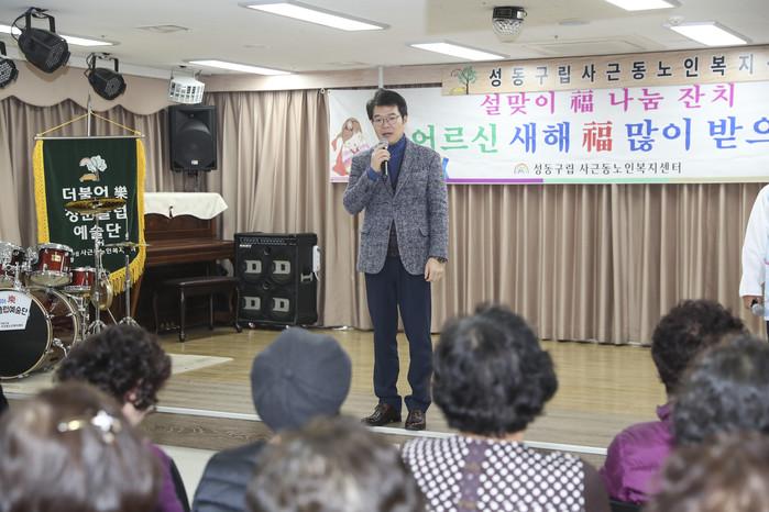 서울 성동구 사근동 노인복지센터는 21일 ‘설맞이 복(福) 나눔 잔치’를 개최, 센터 방문 노인들에게 떡과 과일을 전달했다. 이날 인간문화재 운보 김경배 선생의 배뱅이굿 공연도 펼쳐졌다. 사진은 정원오 구청장이 인사말을 하는 모습. (사진제공=성동구청)