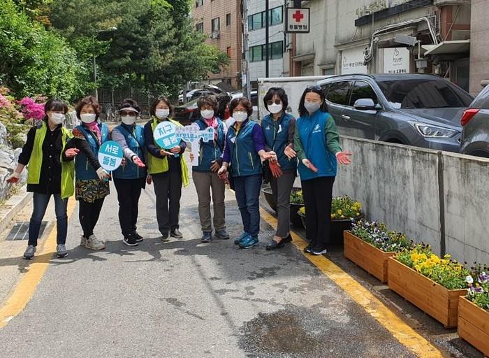 서울 서초구 방배본동은 최근 쓰레기 무단투기 근절을 위해 동광로 이면도로 상습 무단투기지역에 화단을 조성하는 사업을 시작했다. 사진은 쓰레기 무단투기지역에 봄꽃 화분을 설치한 봉사자들이 기념촬영을 하는 모습. (사진제공=서초구청)