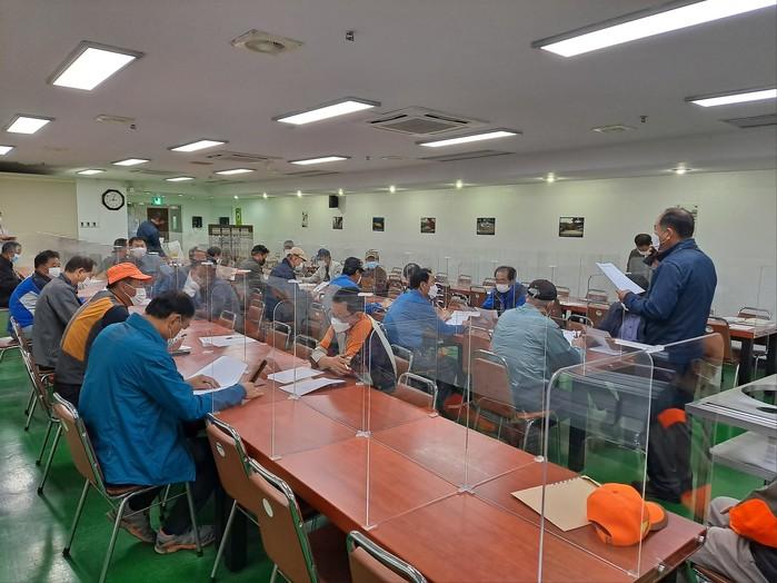 충남 홍성군이 지난 14일 야생동물 피해방지단 44명을 대상으로 총기 안전교육을 실시했다. 교육은 유해 야생동물 포획 준수사항, 총기 관련 안전수칙 등에 관한 내용으로 진행됐다. 사진은 교육이 진행되고 있는 모습. (사진제공=홍성군청)