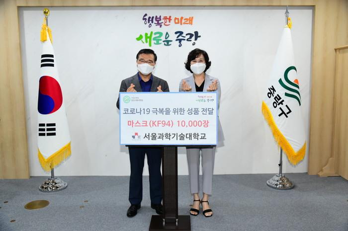 서울 중랑구는 지난 18일 서울과학기술대학교로부터 코로나19 극복을 위한 KF94 마스크 1만장(650만원 상당)을 전달받았다. 전달받은 마스크는 지역내 경로당 46곳에 배부될 예정이다. 사진은 전달식에서 류경기 구청장(왼쪽)이 박미정 서울과학기술대학교 교육부총장과 기념촬영을 하는 모습. (사진제공=중랑구청)