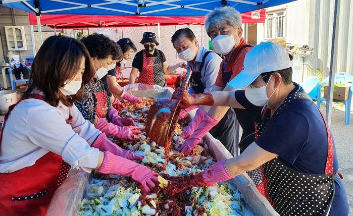 경기 수원시 장안구 조원1동은 최근 지역내 취약계층 이웃들을 위한 ‘사랑의 김치 나누기’ 행사를 진행했다. 참여자들은 양일간 150포기의 김치를 담갔다. 사진은 참여자들이 김치를 담그고 있는 모습. (사진제공=장안구청)