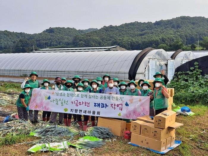 경기 양평군 지평면 새마을회는 11일 지평면 월산리 경작지에서 지난 4월 파종해 친환경으로 재배하는 대파 수확작업을 실시했다. 대파 수익금은 지역의 어려운 이웃을 위해 사용된다. 사진은 이날 새마을회원들이 대파를 수확한 후 기념촬영을 하는 모습. (사진제공=양평군청)