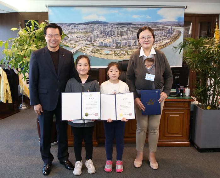 용산구가 최근 구청장실에서 코로나19와 관련해 개인 기부를 한 모범구민 3명에게 표창을 수여했다. 이날 수여식에는 성장현 구청장을 비롯해 모범구민 3명이 참여한 가운데 진행됐다. 사진은 표창 수여 후 기념촬영하는 성 구청장(왼쪽)과 모범구민의 모습. (사진제공=용산구청)