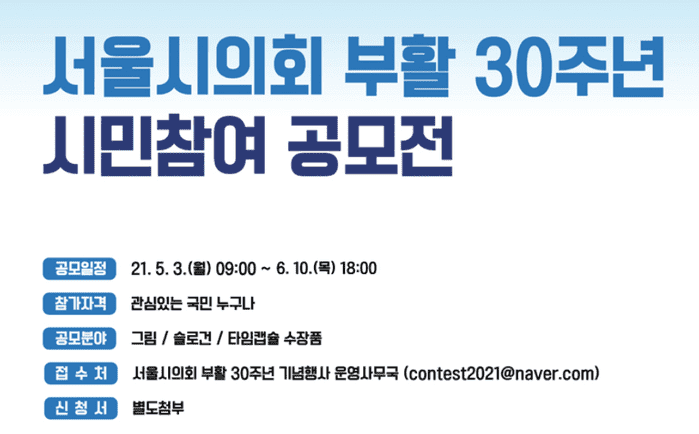 공모신청은 서울시의회 홈페이지에서 참가양식을 다운받아서 신청할 수 있으며, 공모전에 대한 더 자세한 내용은 서울시의회 홈페이지, 서울시의회 부활 30주년 홈페이지, 서울시의회 블로그 등에서 확인할 수 있다.