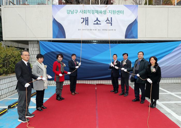 정순균 서울 강남구청장(오른쪽에서 네 번째)이 9일 오후 3시30분 강남구 도산대로 국민연금 강남사옥에서 열린 ‘강남구 사회적경제육성·지원센터 개소식’에 참석했다. 사진은 참석 내빈과 함께 현판제막식에 참여하고 있는 정 구청장의 모습. (사진제공=강남구청)