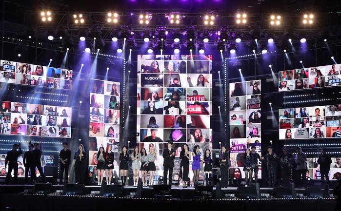 강남구가 ‘온택트 2020 강남페스티벌’의 시작으로 18일 K-POP 스타들이 총출동하는 ‘영동대로 K-POP콘서트’를 코엑스 옥상 특설무대에서 개최했다. 이 콘서트는 국내·외 랜선 관객을 모집해 출연진과 실시간 소통하며 온오프라인 융합 콘서트로 진행됐다. 사진은 콘서트 전출연자들의 모습. (사진제공=강남구청)