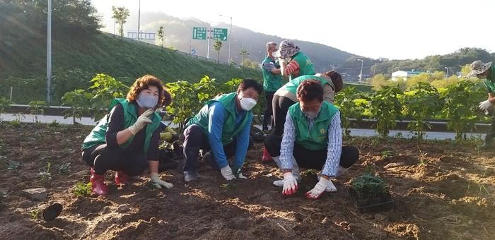 경기 양주시 새마을운동양주시지회는 8일 은현면 하패리 소재 휴경지 200여평에 국화꽃 1500주를 심었다. 이번 꽃심기는 앞으로 2주간에 걸쳐 국화꽃 총 6000주 이상을 은현면·남면 등 지역내 휴경지와 주요 도로 등에 분산해 심을 계획이다. 사진은 봉사자들이 국화꽃을 심고 있는 모습. (사진제공=양주시청)