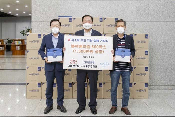 서울 마포구는 지난 23일 (주)자연만세와 더조은포럼으로부터 지역아동센터 이용 아동과 저소득 구민들을 위한 블랙베리즙 600상자(1500만원 상당)를 전달받았다. 사진은 전달식에서 유동균 구청장(가운데)과 관계자들이 기념촬영을 하는 모습. (사진제공=마포구청)