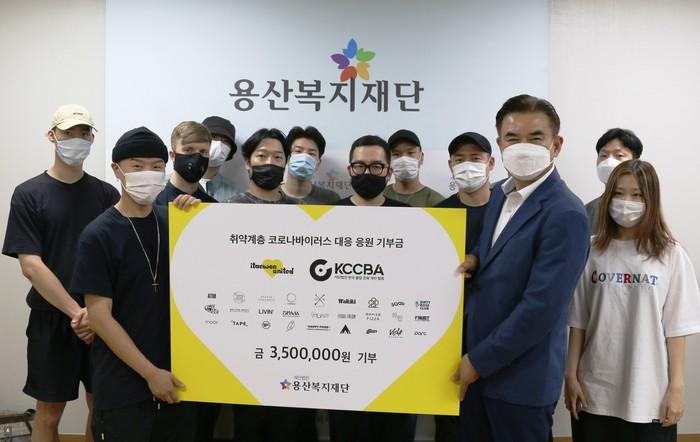 서울 용산구 이태원에 위치한 27개 업체와 한국클럽문화개선협회가 지역 방문 유도를 위해 제작한 티셔츠 판매 수익금 350만원을 지난 9일 용산복지재단에 기부했다. 기부금은 지역내 취약계층을 돕는 데 사용된다. 사진은 기부금 전달 후 관계자들이 기념촬영을 하는 모습. (사진제공=용산구청)