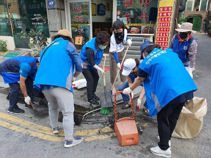 경기 의정부시 송산1동 자율방재단 및 통장협의회는 22일 여름철 집중호우 피해를 예방하기 위해 지역내 도로변 및 골목길 빗물받이 정비를 실시했다. 사진은 이날 참여자들이 빗물받이 내·외부의 토사 및 쓰레기를 제거하는 모습. (사진제공=의정부시청)