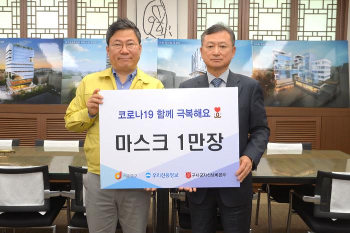 서울 중구는 최근 구청 3층 구청장실에서 우리신용정보로부터 덴탈마스크 1만개, 손소독제 120개를 기증받았다. 우리신용정보는 사회복지·환경보호·농어촌사랑·자원봉사활동 등 총 4가지 테마로 다양한 사회공헌 활동을 펼치고 있으며, 구는 기증받은 물품을 코로나19 지역감염을 막기 위한 예방활동에 사용할 예정이다. 사진은 서양호 구청장(왼쪽)이 기념촬영을 하는 모습. (사진제공=중구청)