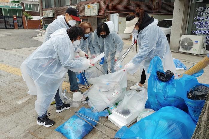 경기 수원시 장안구 정자1동은 최근 골목길 취약지역과 주요도로변을 중심으로 마을 전역을 돌며 환경정비활동을 실시했다. 사진은 이날 참여한 봉사자들이 주민들이 배출한 생활폐기물과 재활용품 쓰레기를 정리해 재분리하고 있는 모습. (사진제공=장안구청)