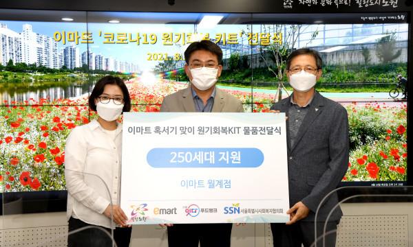 서울 노원구는 10일 (주)이마트 월계점으로부터 코로나19 장기화로 어려움을 겪고 있는 취약계층·홀몸노인 등에 도움이 되길 바란다며 750만원 상당의 ‘코로나19 원기회복키트’를 전달받았다. 사진은 전달식에서 오승록 구청장(가운데)과 관계자들이 기념촬영을 하는 모습. (사진제공=노원구청)