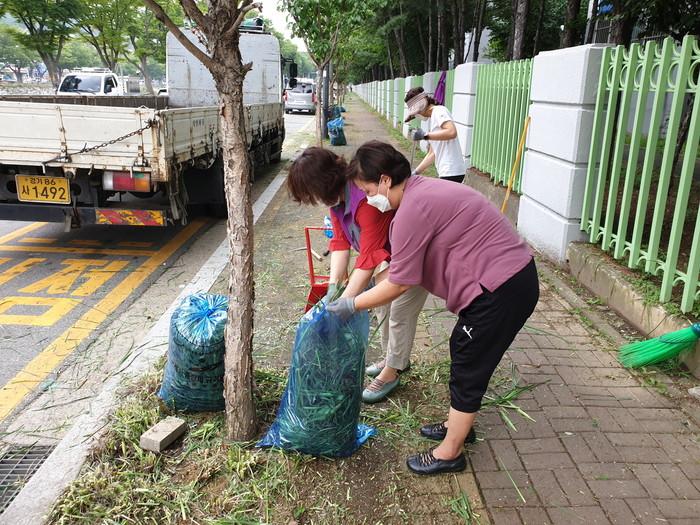 경기 안산시 상록구 월피동 통장협의회는 최근 지역내 도로변에 장마로 무성하게 자란 잡초 제거 및 환경정화 활동을 펼쳤다. 사진은 이날 참여한 봉사자들이 도로변에서 잡초를 제거하고 있는 모습. (사진제공=안산시청)