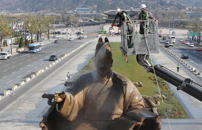 9일 오전 종로구 광화문 광장에서 서울시 관계자들이 세종대왕상 물청소를 하고 있다.