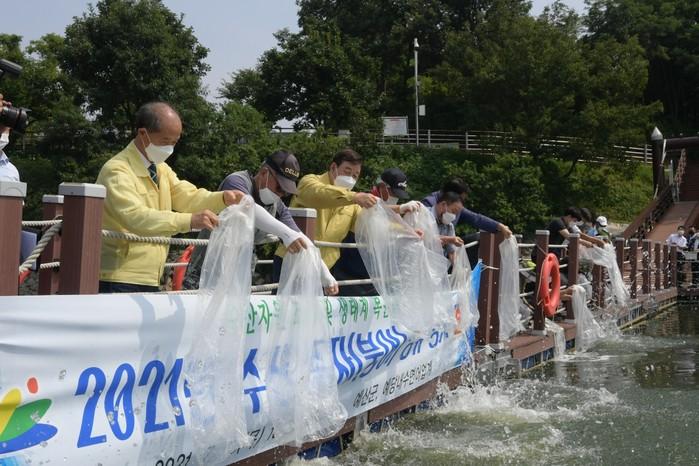 충남 예산군이 29일 예당호 출렁다리 인근 부잔교에서 토종붕어종자 72만여마리를 방류하는 행사를 개최했다. 이날 행사에는 황선봉 군수와 이승구 군의회 의장을 비롯해 예당내수면어업계 어업계원 등이 참석했으며, 코로나19 방역수칙을 준수한 가운데 내수면 생태 활성화 및 어족자원 조성을 위해 붕어종자를 방류했다. 사진은 황 군수(왼쪽 세 번째)와 관계자들이 붕어종자를 방류하고 있는 모습. (사진제공=예산군청)