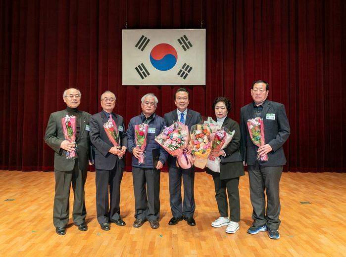 노현송 서울 강서구청장은 10일 강서구민회관에서 열린 ‘대한노인회 강서구지회 성과보고회’에 참석해 어르신사랑방 활성화 유공자 5명에게 표창을 수여했다. 사진은 노 구청장(오른쪽에서 세 번째)이 표창 수여자들과 기념촬영을 하는 모습. (사진제공=강서구청)