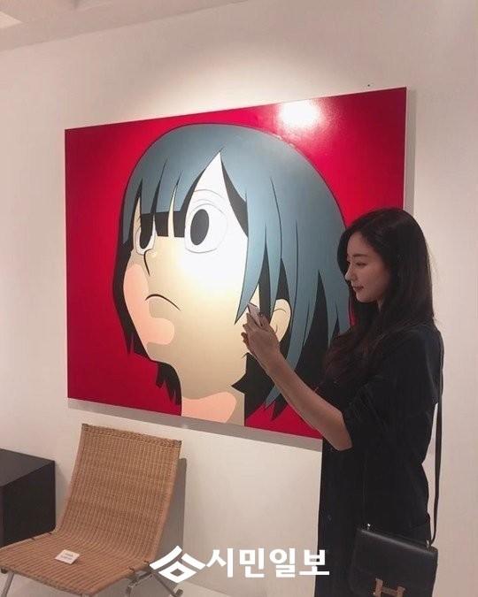 공개된 영상 속 김사랑은 그림 옆에서 셀카를 찍고 있다.