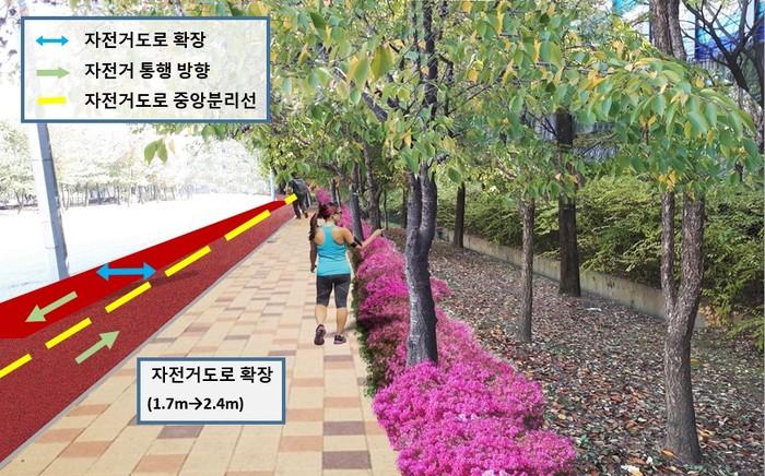 먼저, ▲자전거 전용도로는 사자교~장지교 구간에 차로폭을 축소하고 자전거도로를 확장시켜 양방통행이 가능하도록 총길이 1km, 폭 2.4m규모로 조성할 계획이다.