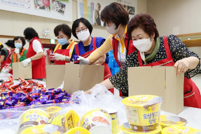 서울 성동구가 코로나19로 인해 가정에서 시간을 보내는 저소득 가구 아동 340명을 대상으로 각종 식료품으로 구성된 꾸러미를 지원하는 '행복꾸러미 나눔 행사'를 지난 10일 개최했다. 이날 구 여성단체연합회 등 11개 단체 회원들은 포장한 꾸러미를 해당 가정에 직접 배달했다. 사진은 꾸러미를 포장하고 있는 단체 회원들의 모습. (사진제공=성동구청)