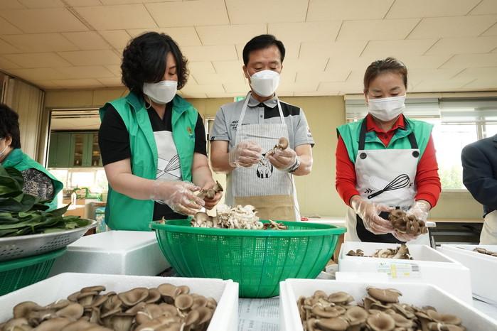 서울 성북구 장위3동 새마을부녀회에서 최근 홀몸노인 가구를 대상으로 '밑반찬 나눔 활동'을 펼쳤다. 이 행사는 주민참여예산사업으로 올해 8~12월 총 3회에 걸쳐 지역내 노인 40가구에 삼계탕 및 3종 건강식 반찬을 지원한다. 사진은 밑반찬 나눔을 위해 이승로 구청장(가운데)이 부녀회원들과 같이 버섯을 손질하고 있는 모습. (사진제공=성북구청)