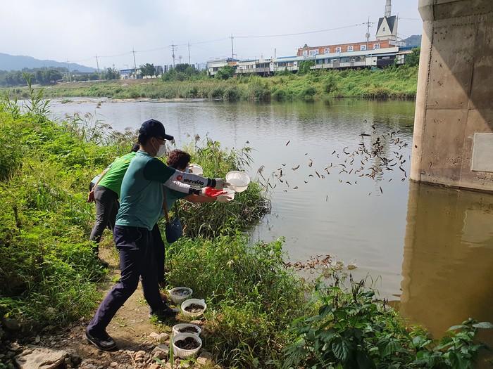 경기 동두천시 생연2동 새마을남녀지도자협의회는 최근 송내동 새마을남녀지도자협의회와 합동으로 신천 수질개선을 위해 ‘EM흙공’을 투척하고 ‘미꾸라지’를 방생하는 환경정화 활동을 진행했다. 사진은 참여자들이 미꾸라지를 방생하고 있는 모습. (사진제공=동두천시청)