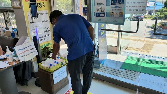 충남 홍성군 결성면은 65세 이상 노인인구의 비율이 53%로 방문 민원인이 대부분 더위에 취약한 노인인 만큼 이들을 위한 맞춤형 행정서비스의 일환으로 폭염극복 얼음생수를 제공하고 있다. 사진은 행정복지센터 출입구에 비치한 얼음생수를 민원인이 이용하고 있는 모습. (사진제공=홍성군청)
