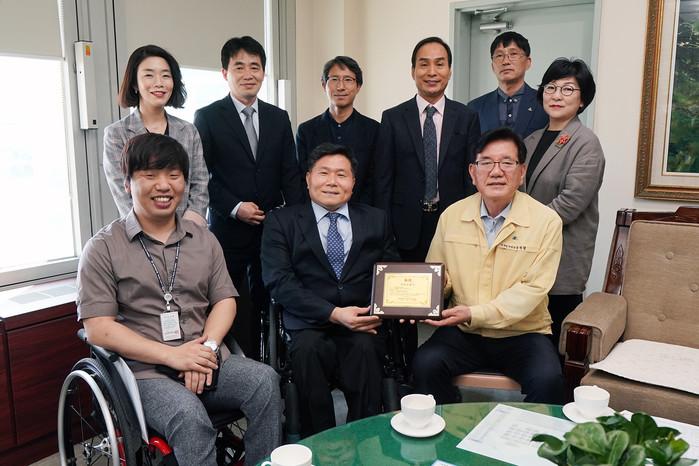 6일 서울시장애인체육회가 동대문구장애인체육회 회장을 겸직하게 된 유덕열 서울 동대문구청장에게 인증패를 전달하고 향후 지역내 장애인 체육 활성화를 위한 적극적인 지원을 요청했다. 사진은 인증패를 전달받고 기념촬영을 하고있는 유덕열 구청장(앞줄 오른쪽)의 모습. (사진제공=동대문구청)
