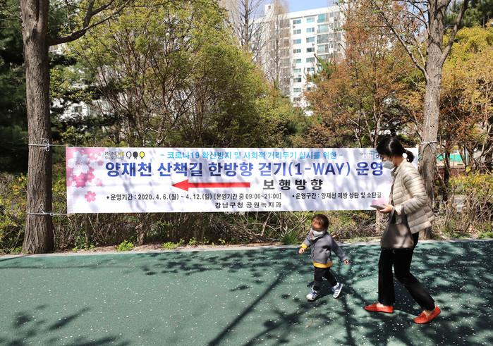 6일 강남구가 ‘사회적 거리두기’가 연장됨에 따라 오전 9시~오후 9시 양재천 산책로를 한 방향으로 통행하는 '양재천 산책길 한방향 걷기 (1-WAY)'를 운영했다. 사진은 한방향으로 걷고 있는 시민들의 모습. (사진제공=강남구청)