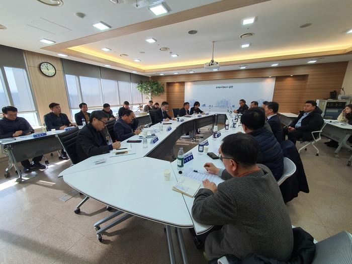 서울 금천구는 최근 구청 소회의실에서 ‘G밸리(서울디지털산업단지)’의 시급한 문제를 풀고 발전전략을 논의하기 위한 간담회를 개최했다. 이날 행사에는 유성훈 구청장을 비롯해 독산역 주변 지식산업센터 회장 및 관리소장 등 10여명이 함께했다. 사진은 참여자들이 회의하는 모습. (사진제공=금천구청)