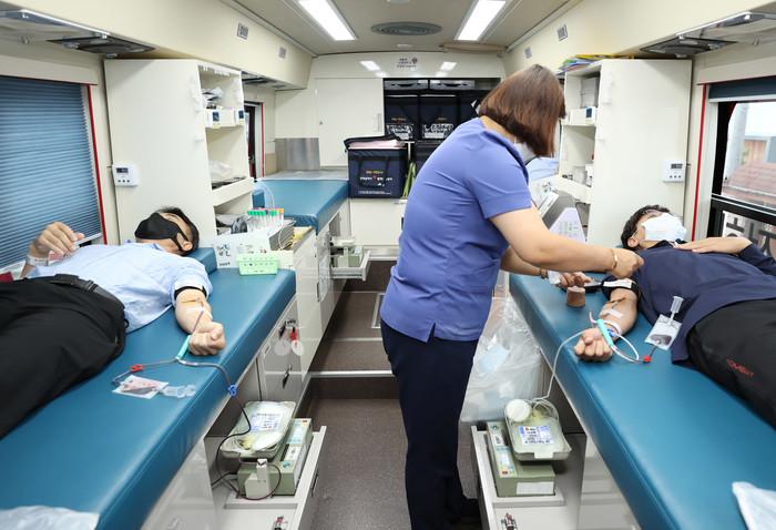 전남 강진군은 최근 군청 앞 광장과 보건소에 마련된 대한적십자사 광주·전남혈액원 헌혈 버스에서 단체헌혈을 진행했다. 사진은 이날 참여자들이 헌혈을 하고 있는 모습. (사진제공=강진군청)