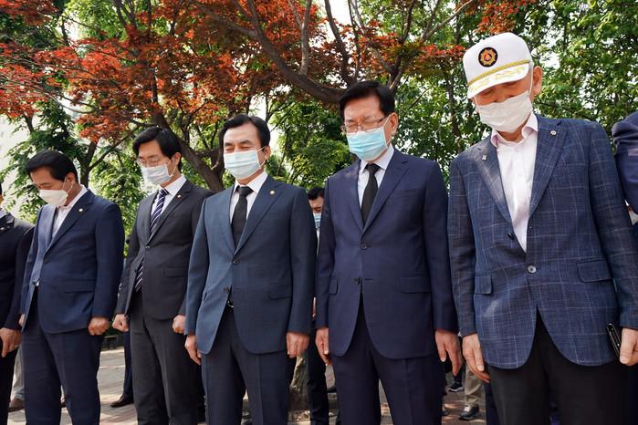 유덕열 서울 동대문구청장이 최근 제65회 현충일을 맞아 참전유공자 명비와 충혼탑이 자리해 있는 전농동 마을마당을 방문, 순국선열의 숭고한 정신과 희생을 되새기며 묵념했다. 사진은 묵념을 하고 있는 유 구청장(오른쪽 두 번째)과 참석자들의 모습. (사진제공=동대문구청)