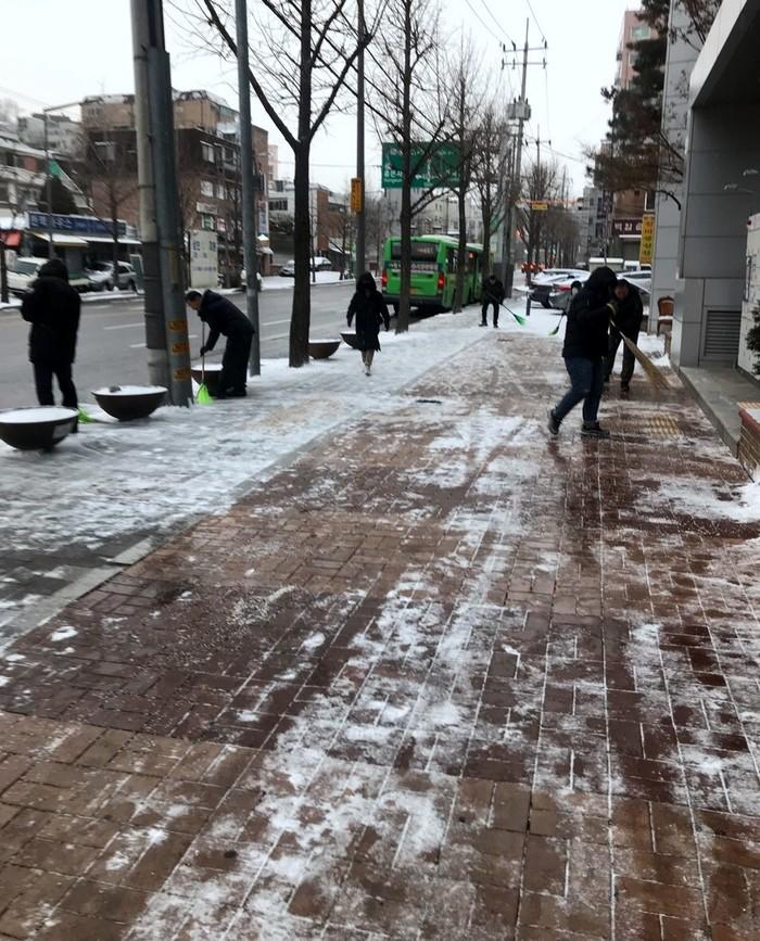 제설대책 근무에 나선 서대문구 홍은2동 주민센터 직원들이 17일 아침 보행자 안전을 위해 지역내 보도에 쌓인 눈을 쓸고 있다.