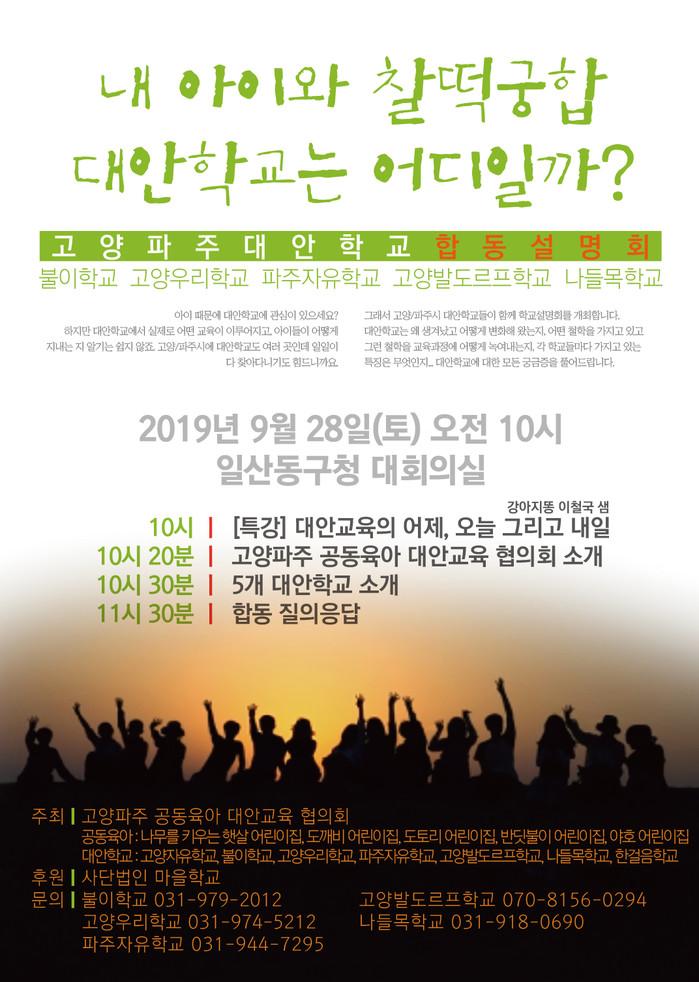 고양 파주 공동육아 대안교육협의회는 오는 28일 오전 10시 고양시 일산동구청 대회의실에서 고양·파주지역 대안학교들이 참여하는 합동설명회를 개최한다.