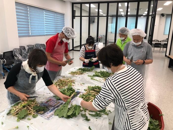 경기 여주시 중앙동행정복지센터는 10일 중앙동지역사회보장협의체와 함께 말복을 맞아 지역내 저소득 홀몸노인 50가구에 열무물김치를 담가 삼계탕·라면 등과 함께 전달했다. 사진은 이날 참여한 봉사자들이 열무를 다듬고 있는 모습. (사진제공=여주시청)