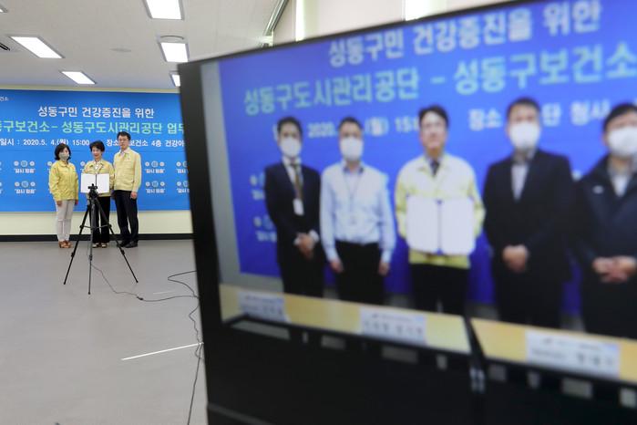서울 성동구 보건소와 성동도시관리공단이 최근 구민 건강 증진을 위한 업무 협약을 체결했다. 이번 협약은 코로나19 확산 방지를 위한 잠시 멈춤 캠페인의 일환으로, 협약식은 비대면 화상으로 진행됐다. 사진은 화상 회의를 통해 협약을 체결하고 있는 모습. (사진제공=성동구청)