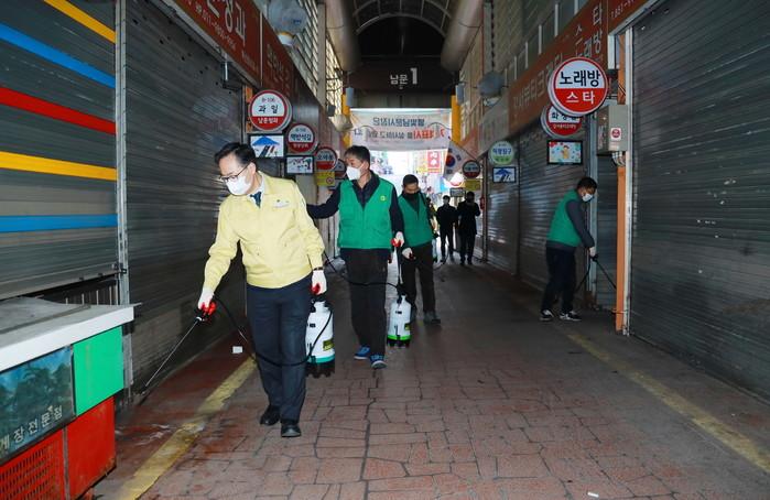 금천구는 코로나19 확산방지를 위해 동별로 새마을지도자회, 주민자치회, 통장 등 주민들이 중심이 되어 능동적인 방역작업을 실시하고 있다. 사진은 2일 유성훈 구청장 및 주민자율방역단이 독산3동 남문시장에서 각 상가 앞을 소독하고 있는 모습. (사진제공=금천구청)