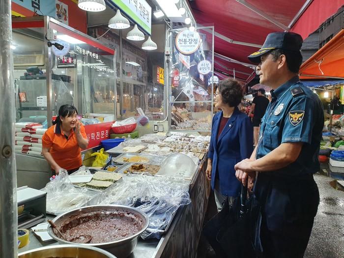 최근 박희자 서울 강동구의회 박희자 의원(성내 1·2·3동)이 행복한 명절분위기 조성을 위해 ‘추석명절 특별 안전 활동’의 일환으로 강동구청 및 강동경찰서와 함께 성내동 일대의 특별 합동순찰을 실시했다. 사진은 시장 상인과 이야기를 나누고 있는 박 의원과 경찰관의 모습. (사진제공=강동구의회)