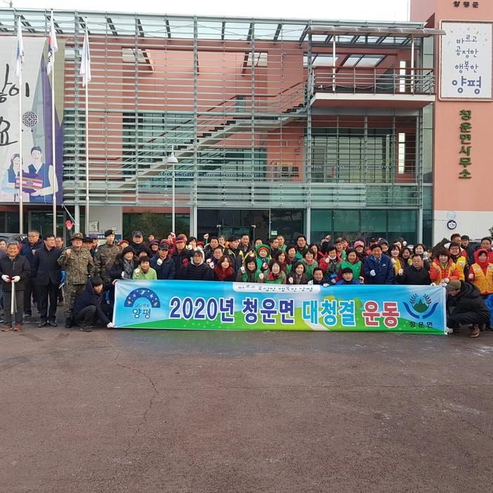 경기 양평군 청운면은 20일 고향을 찾는 귀성객들에게 깨끗하고 청결한 명절 분위기를 조성하기 위해 지역주민 170여명이 참여한 가운데 귀성객들의 통행량이 많은 주요 도로변, 주택가 골목 등을 대청소했다. 사진은 기념촬영을 하는 모습. (사진제공=양평군청)