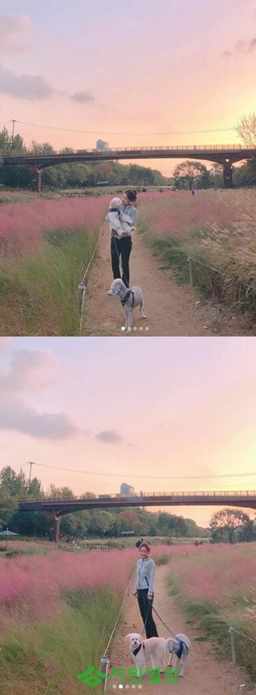 사진에는 홍수아가 분홍빛으로 물든 하늘과 핑크뮬리를 배경으로 반려견들과 행복한 시간을 보내고 있는 모습이 담겨 있다.