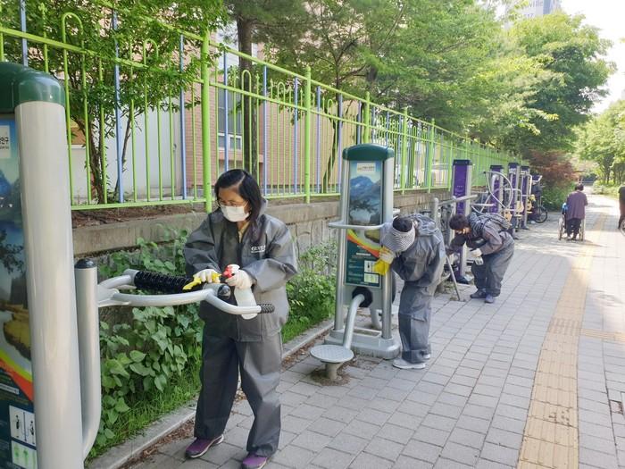 경기 수원시 장안구 정자3동은 26일 유동인구가 많은 정자동 중심상가와 지역내 어린이공원 일대에서 대대적인 방역활동을 벌였다. 이날 방역활동에 참여한 자율방역단과 공무원 등은 주민들이 자주 이용하는 버스정류장을 비롯해 동 청사 민원실 내부, 어린이공원 내 운동기구와 벤치 등을 꼼꼼히 소독했다. 사진은 참여자들이 방역을 하고 있는 모습. (사진제공=장안구청)
