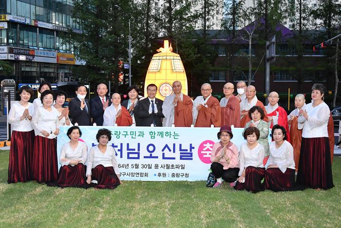 서울 중랑구는 6일 불기 2564년 ‘부처님 오신 날’ 기념 범종(성덕대왕 신종, 국보29호) 점등식을 개최했다. 구 사암연합회가 주최하고 구가 주관하는 ‘범종 점등식’은 류경기 구청장 및 사암연합회 임원스님 등이 참석한 가운데 진행됐다. 사진은 류 구청장(가운데) 및 참여자들이 기념촬영을 하는 모습. (사진제공=중랑구청)