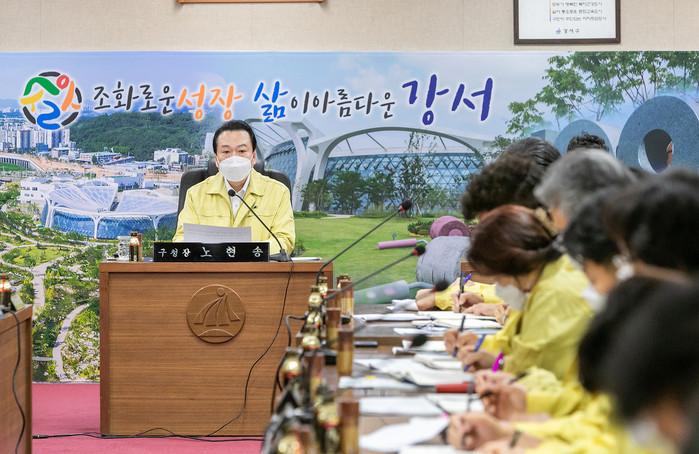 서울 강서구는 2일 간부회의를 열고 단계적 일상회복 ‘위드 코로나’로의 방역체계 전환을 위한 총력 대응을 지시했다. 사진은 노현송 구청장(가운데)이 위드 코로나 대책회의를 주재하고 있는 모습. (사진제공=강서구청)