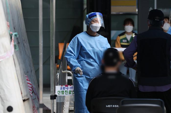 8일 노원구 보건소 선별진료소에서 보건소 관계자가 코로나19 진단 검사를 위해 오가고 있다.
