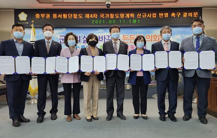 충북 괴산군의회가 11일 중부권 동서횡단철도를 제4차 국가 철도망 구축 계획에 반영해달라고 촉구했다. 사진은 결의문 발표하는 괴산군의회 의원들.