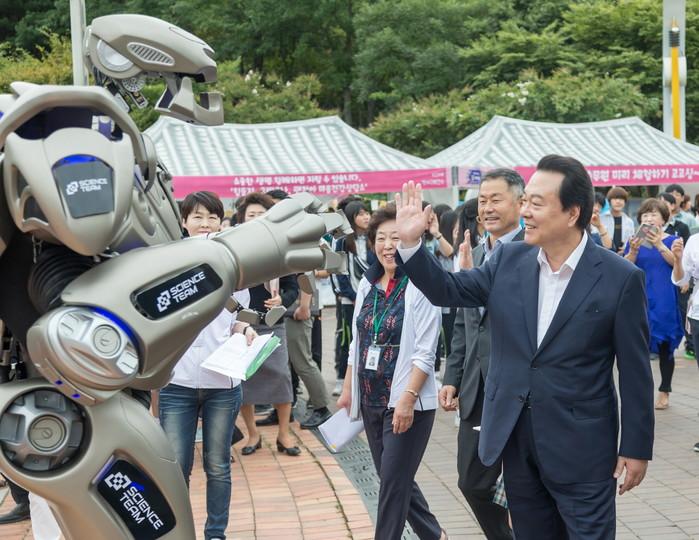 서울 강서구는 최근 방화근린공원에서 ‘제6회 드림잡 페스티벌’을 개최했다. 이날 4차 산업혁명, 문화·예술 등 분야별 5개 체험마을과 163개의 체험부스가 마련됐다. 사진은 노현송 구청장이 행사장에 마련된 로봇에 인사하는 모습. (사진제공=강서구청)