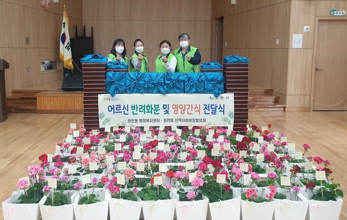 경기 수원시 영통구 원천동지역사회보장협의체가 28일 지역내 저소득층 노인 82가구에 ‘반려화분 및 영양간식’을 전달했다. 이 날 반려화분 및 영양간식 전달은 장기화된 코로나19로 인해 심리적으로 불안감과 고독감이 증가한 노인들의 마음건강을 지키고 함께 이겨내고자 하는 취지로 진행됐다. 사진은 관계자들이 반려화분을 앞에 두고 기념촬영을 하는 모습. (사진제공=영통구청)
