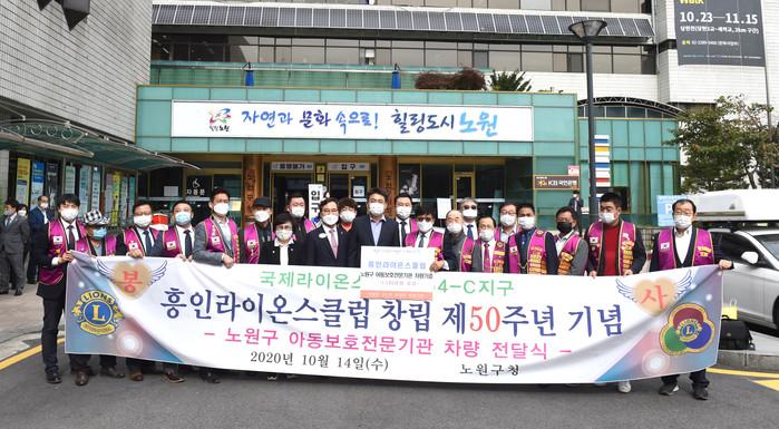 서울 노원구는 14일 서울흥인라이온스클럽으로부터 지역내 아동보호를 위한 차량 기아 모닝을 기증받았다. 사진은 차량 기증식에서 오승록 구청장(가운데)이 관계자들과 기념촬영을 하고 있는 모습. (사진제공=노원구청)